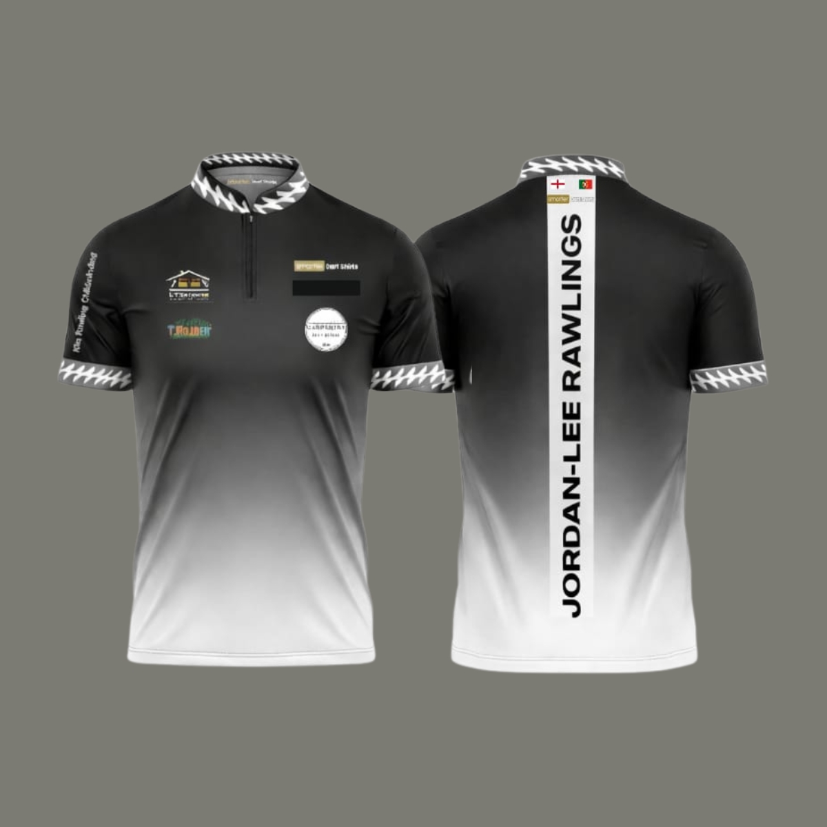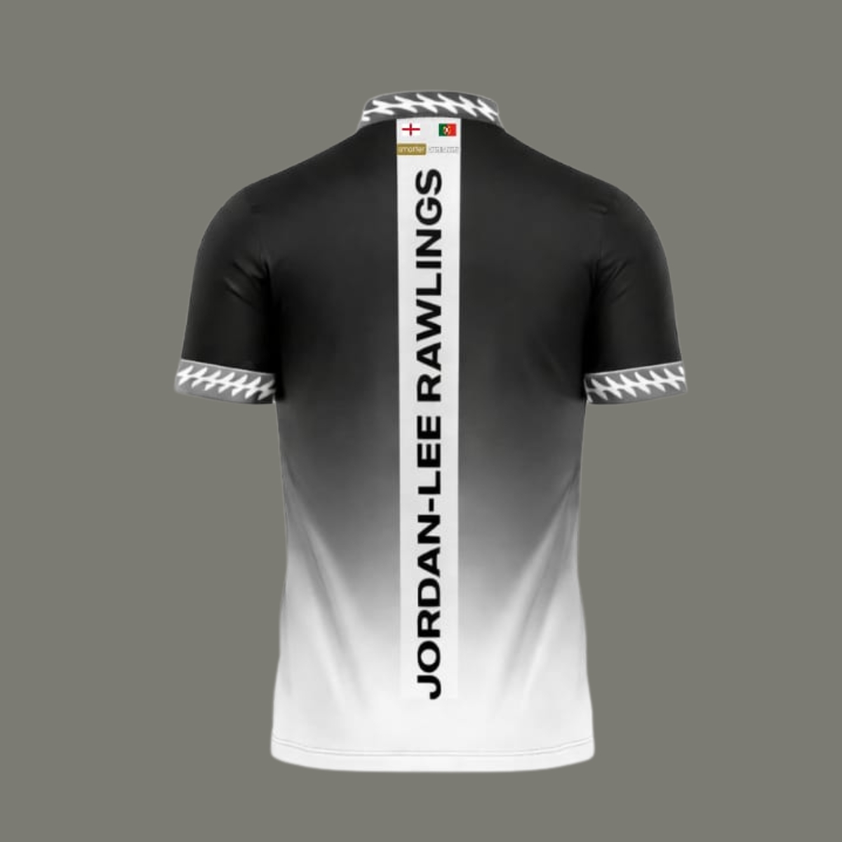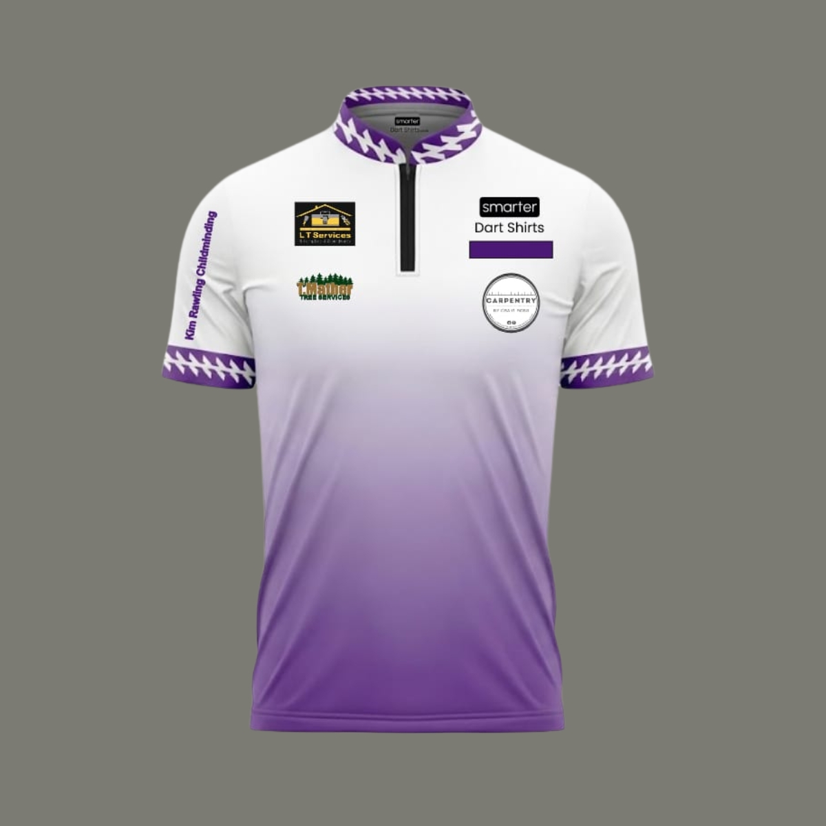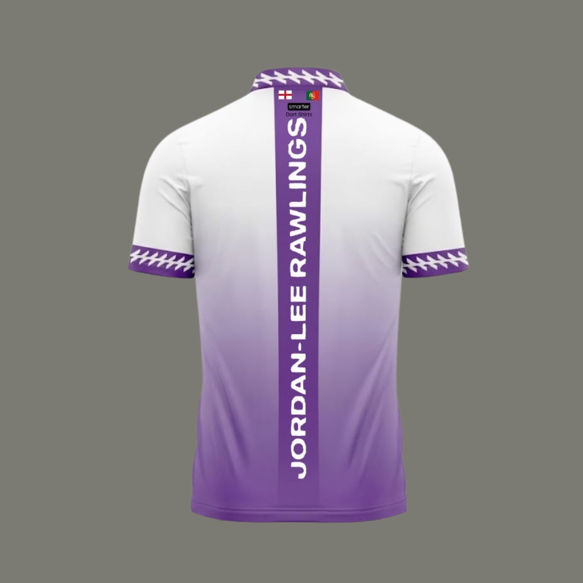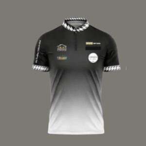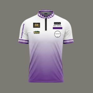 A sleek white-to-purple gradient dart shirt featuring bold vertical back personalisation and premium sponsor placement. Designed for players who want performance, presence and personality on the oche.